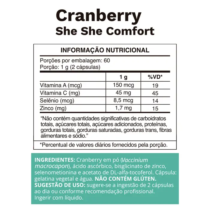 O suplemento oferece dose padronizada de cranberry associada a micronutrientes importantes para a saúde. Sua formulação foi desenvolvida para uso diário, com cápsulas práticas e sem adição de açúcar, sendo uma alternativa conveniente para complementar a ingestão desses nutrientes.