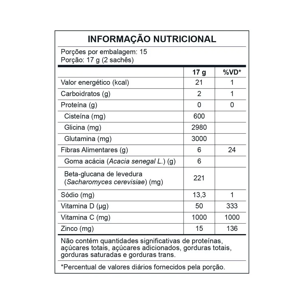 Goma acácia (Acacia senegal L.), L-Glutamina, L-Glicina, beta-glucana de levedura (Saccharomyces cerevisiae), ácido ascórbico, acetilcisteína, bisglicinato de zinco, colecalciferol (vitamina D3), aroma idêntico ao natural de limão, acidulante ácido cítrico, antiumectantes bicarbonato de sódio, carbonato ácido de sódio, dióxido de silício e estearato de magnésio, edulcorante glicosídeo de esteviol de Stevia rebaudiana Bertoni e corante clorofilas.