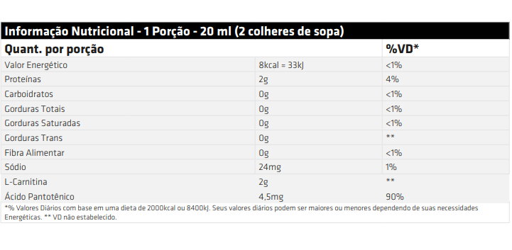 A fórmula é livre de corantes artificiais, não contém carboidratos e é adoçada com Stevia, um adoçante natural sem calorias. Além disso, conta com vitamina B5, que auxilia no metabolismo energético e contribui para otimizar a absorção da L-carnitina pelo organismo.