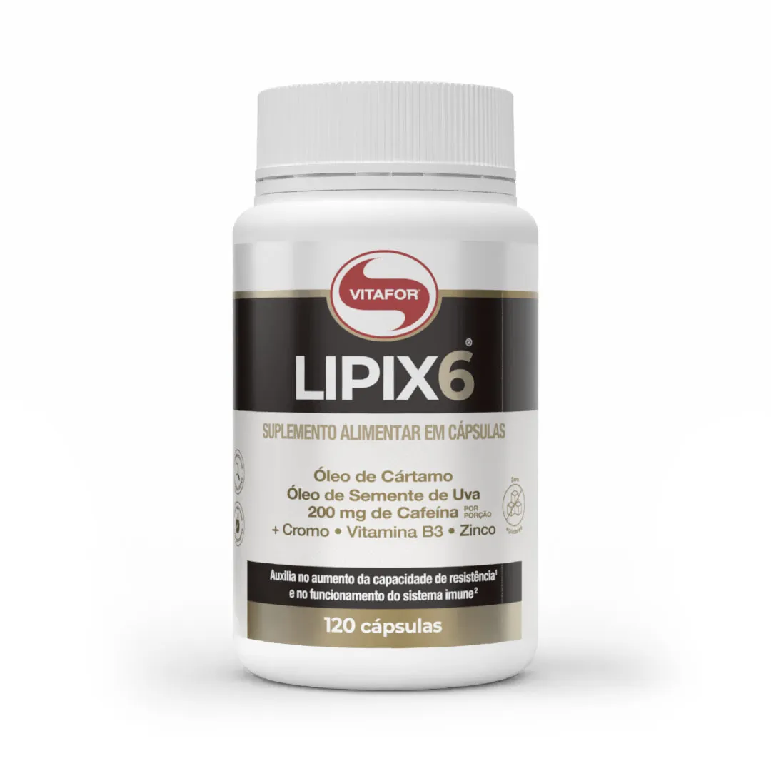 O LIPIX 6® Vitafor 120 Cápsulas é um suplemento alimentar especialmente formulado para quem busca mais energia, foco e metabolismo ativo no dia a dia. Sua composição combina ingredientes de alta qualidade como cafeína, óleo de cártamo, óleo de semente de uva, vitaminas e minerais essenciais que atuam em sinergia para potencializar o desempenho físico, favorecer a queima de gordura e apoiar um estilo de vida mais saudável e ativo.