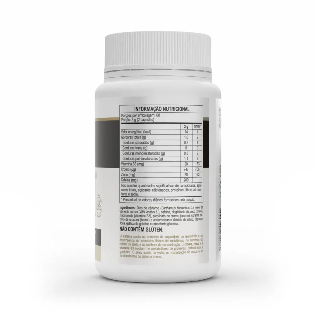 A cafeína presente na fórmula contribui para o aumento da resistência e da concentração, enquanto o óleo de cártamo e o óleo de semente de uva auxiliam nos processos metabólicos e oferecem ação antioxidante. Já os minerais como cromo e zinco, juntamente com a vitamina B3, colaboram para o metabolismo eficiente de proteínas, carboidratos e gorduras, além de manter funções importantes como imunidade, visão e saúde da pele.